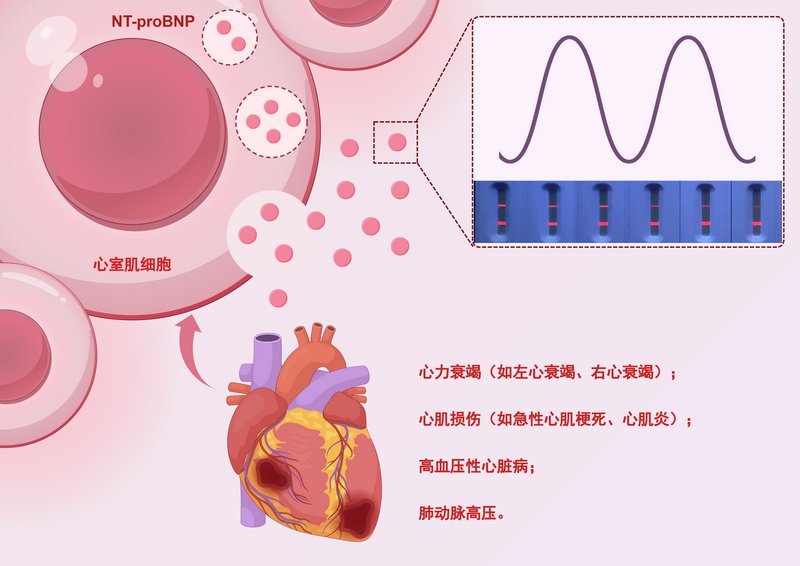 心脏在心力衰竭时,心肌细胞释放NT-proBNP后被试剂盒通过时间分辨荧光系统检出的示意图