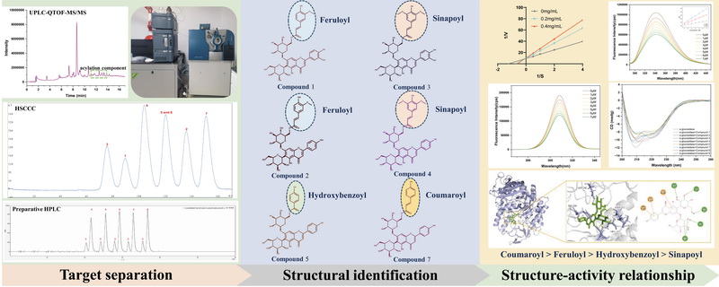 中国科学院西北高原生物研究所高原藏药资源质控与药理毒理评价研究团队通过建立UPLC-QTOF-MS/MS结合高速逆流色谱和制备液相色谱的靶向分离技术,成功从青稞苗中分离得到6个以大麦黄苷和皂草黄苷为母核的不同酰基修饰的衍生物。通过多维度的分子相互作用研究发现,大麦黄苷和皂草黄苷酰基化后,其α-葡萄糖苷酶抑制活性均明显提高,表现为香豆酰基>阿魏酰基>对羟基苯甲酰基>芥子酰基。6个酰化黄酮与α-葡萄糖苷酶均具有较高的结合常数,主要通过范德华力和氢键作用占据α-葡萄糖苷酶的活性位点并形成稳定的复合物,并改变关键氨基酸残基和二级结构,从而降低酶催化活性。该研究为复杂天然产物的靶向分离纯化以及酰化黄酮与α-葡萄糖苷酶抑制活性之间的构效关系的研究提供了新的思路。
