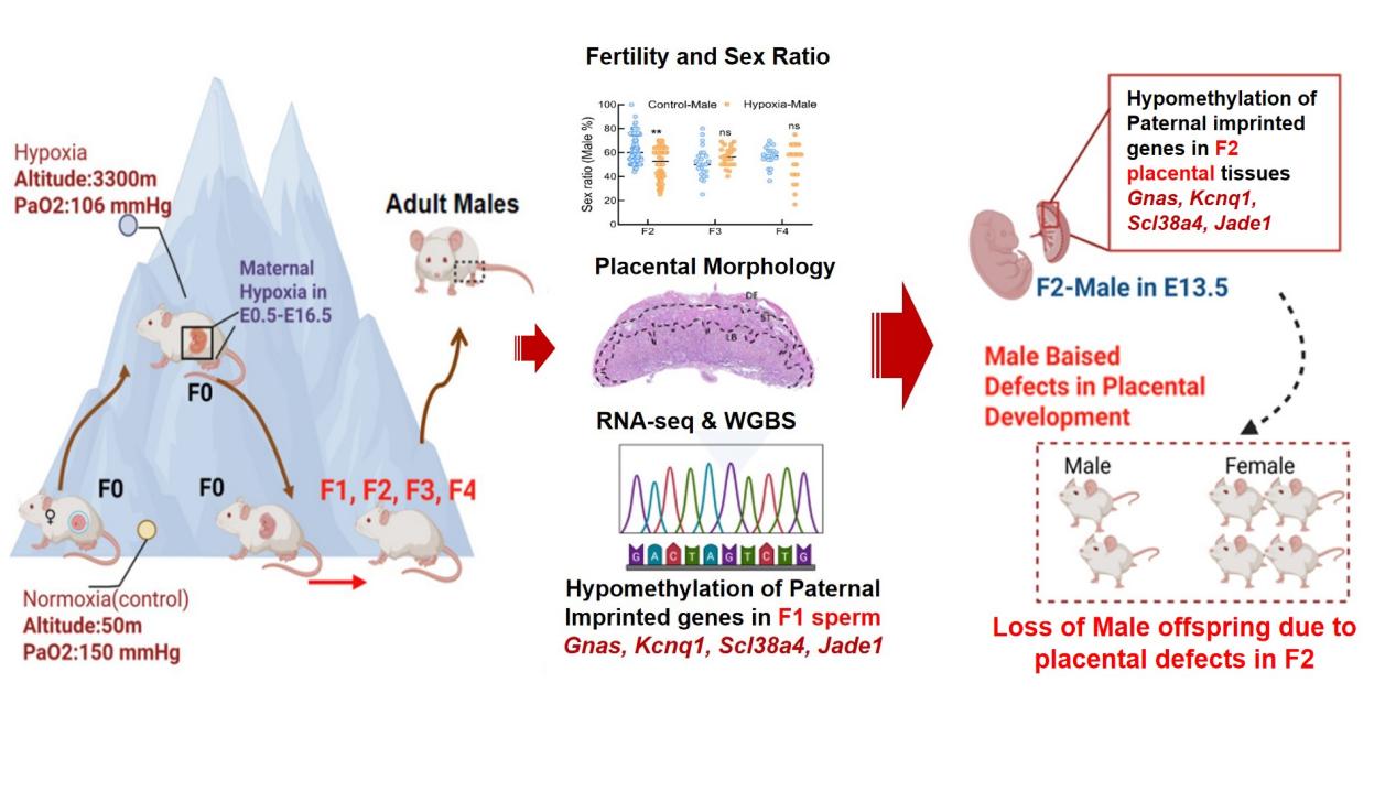 为探究母体低氧环境暴露对子代的跨代影响,中国科学院西北高原生物研究所动物生态与资源保护研究团队建立了孕期低氧暴露小鼠模型,将经历过孕期低氧暴露的小鼠(F0)转运至低海拔后,出生的雄性小鼠和对照雌鼠合笼,连续饲养四代(F1-F4)。从2018年 9月到 2023年 8月,通过大量出生性别统计和不同发育阶段的性别鉴定,发现母体孕期低氧暴露会造成F2代雄性个体显著减少。进一步的分析发现F2雄性减少是由于在胚胎期13.5天发生的胚胎特异性丢失。雄性胚胎丢失的主要原因为胎盘形态和功能异常。研究团队通过胎盘转录组和全基因组DNA甲基化测序联合分析,发现父源印记基因Slc38a4,Gnas, Jade1 和Kcnq1表达异常。随后,通过对F1代小鼠成熟精子与F2代雄性胎盘全基因组DNA甲基化进行联合分析,结果发现以上印记基因DNA甲基化模式高度相似。这说明经历胚胎期低氧的F1代雄性小鼠的精子存在甲基化异常,并且可以进一步影响F2雄性个体生长发育进而导致性别比例异常。该工作系统地揭示母体低氧暴露对F1及F2代发育影响的跨代遗传机制,为深入理解高原低氧暴露的生殖和健康风险提供了新的表型数据。