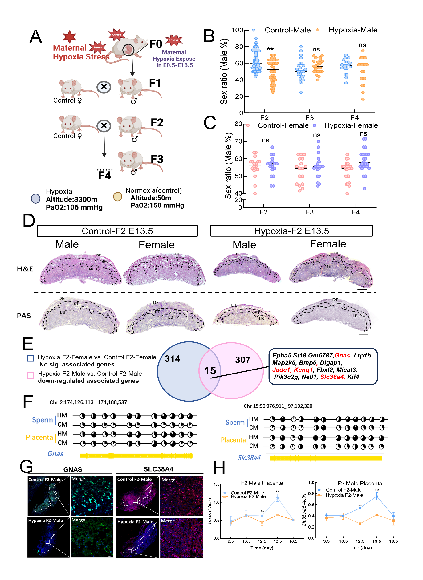 文章代表图片A:低氧暴露及传代实验模式图;B:F2-F4代雄性组胚胎出生性别比例统计;C:F2-F4代雌性组胚胎出生性别比例统计;D:H&E染色分析F2代E13.5不同性别小鼠胎盘形态;EWGBS与转录组联合分析筛选差异父源印记基因;F候选基因在F1精子和F2胎盘中甲基化位点的甲基化水平;G候选基因在E13.5胎盘中的蛋白表达免疫荧光染色;H候选基因在F9.5-E16.5胎盘中的基因表达变化趋势。