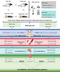 雌雄小鼠应激脑-肠轴调控差异示意图