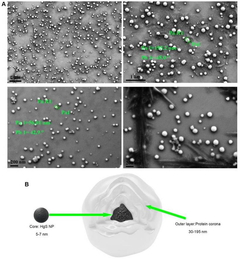 中国科学院西北高原生物研究所高原药用资源生态保护与繁育研究团队通过建立创新性金属制剂研究体系,首次在细胞、小鼠和人体血液中证实金属制剂能够被生物合成为粒径均一的HgS 纳米颗粒。更重要的是通过分离纯化手段首次观察到具有完整蛋白冠的金属纳米颗粒。相对纯净完整结构的呈现不仅直观证实了蛋白冠的存在,也为蛋白冠中蛋白质的分析奠定了基础。蛋白冠蛋白质组成一直以来存在巨大分歧。本研究中通过分析HgS纳米颗粒蛋白质组成,证实金属纳米颗粒蛋白冠中蛋白质类型多样,初步排除了蛋白冠仅由血清白蛋白组成的相关报道。