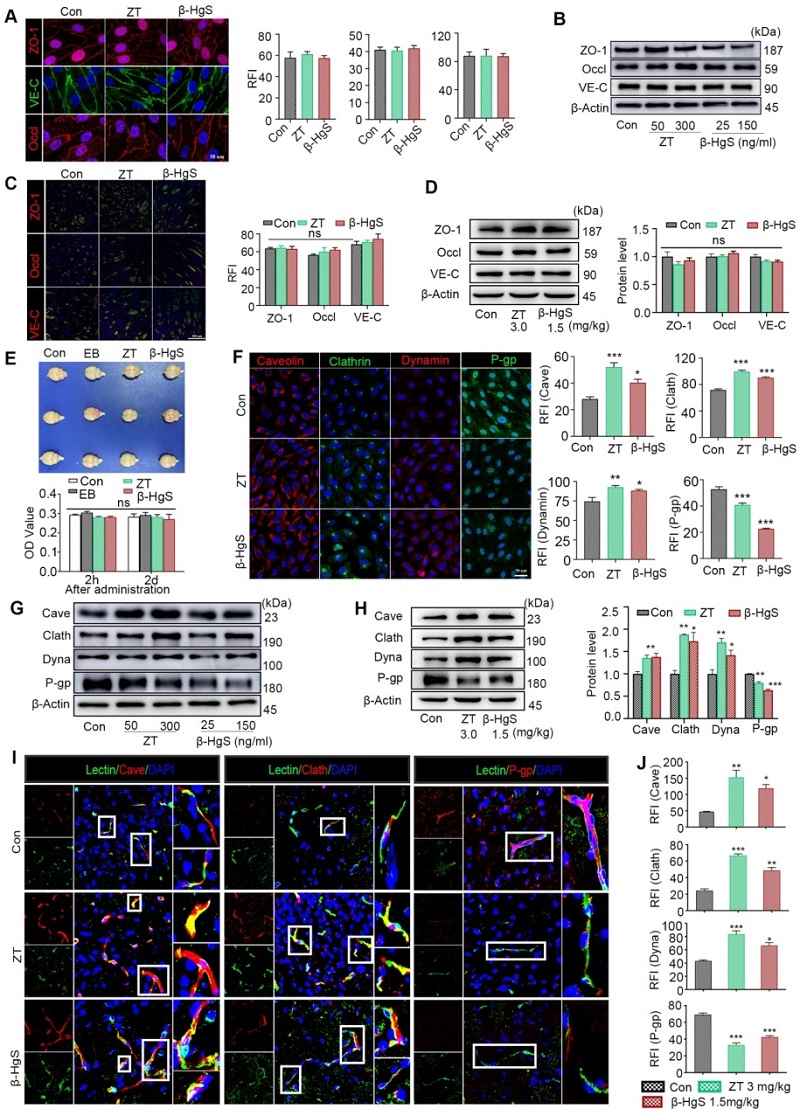 通过细胞蛋白组学分析结合体内外蛋白验证,初步证实金属制剂主要通过调节血脑屏障中的转胞吞作用实现高效的跨脑递药功能。它能够通过上调脑微血管中caveolin,clathrin,和 dynamin蛋白的表达促进药物向脑内转运,同时显著降低 P-gp的表达,以减少血脑屏障对药物的外排作用,从而实现药物在脑内的高效富集。另外,值得关注的是,HgS金属制剂并没有引起血脑屏障紧密连接相关蛋白的表达降低,说明它对药物的入脑作用并不是通过血脑屏障结构的暂时性开放而实现的。