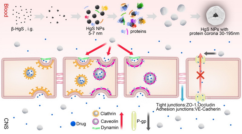 本研究首次揭示了中藏药核心金属制剂HgS可以在生物体内合成直径为30-195nm的纳米颗粒,并通过调节血脑屏障中的内吞作用促进不同结构类型的药物进入大脑,从而实现协同增效作用。特别值得注意的是,我们不仅在体内和体外观察到了HgS纳米颗粒的生物合成,而且还获得了高等生物合成的HgS纳米颗粒的最清晰和完整的形态特征。金属制剂在中医药中一直是一种独特的制剂类型。尽管不断受到质疑,但它们在临床应用中的独特功效从未被取代。这项研究可能为进一步揭示金属制剂的协同机制开辟新思路。