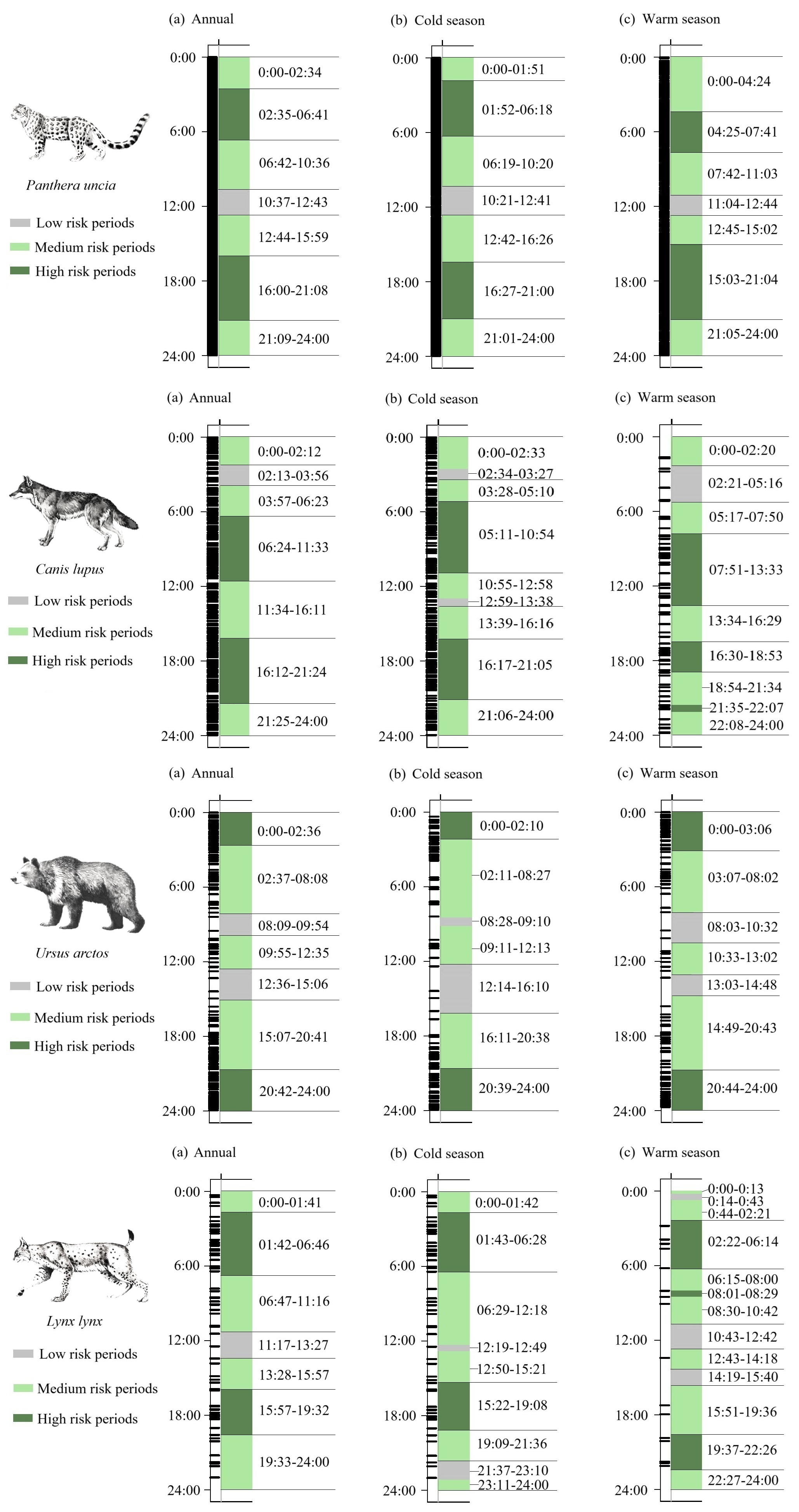 近年来,三江源地区人兽冲突问题愈演愈烈,导致当地牧民对野生动物的态度由积极转向消极,影响了保护工作的可持续开展,进而成为三江源国家公园高质量建设面临的主要问题之一。三江源地区主要肇事动物为雪豹(Panthera uncia)、狼(Canis lupus)、猞猁(Lynx lynx)和棕熊(Ursus arctos),前三个物种以捕食家畜为主,而棕熊主要破坏房屋甚至会造成人身伤亡。为缓解该地区四个物种引发的人兽冲突问题,中国科学院西北高原生物研究所应用动物行为与保护团队在三江源地区人兽冲突严重的地区布设了422台次红外相机并收集近10年(2014年07月至2024年04月)的影像资料,累积监测面积达2,580 km2,有效相机工作日102,913天,获得雪豹、狼、棕熊和猞猁的有效照片分别为15,424张,1,778张,3,594张和344张。基于这些数据,采用核密度估计法和条件循环核密度估计法分析了上述四种食肉动物的日活动节律模式,并依此划分了潜在人兽冲突发生的高、中、低风险时段。结果表明,四种大型食肉动物均为夜行性动物,但物种的活动高峰时段存在明显差异。与其他三个物种不同,狼的日活动模式在冷暖两季表现相反。针对风险时段,人与雪豹潜在冲突有两个高风险时段,分别是凌晨02:35-06:41和16:00-21:08;人与狼潜在冲突的高风险时段为凌晨06:24至中午11:33和16:12-21:24;人与猞猁潜在冲突的高风险时段为凌晨01:42-06:46和15:57-19:32。研究认为,在这些高风险时段实施有针对性的家畜管理策略是降低家畜被捕食风险的关键。此外,以棕熊为例,在夜间,尤其是20:42-次日02:36,是该物种进入牧民房屋的高峰时段,期间,牧民应加强警戒,通过饲养犬只并借助声、光、电等发生设备,及时发现并驱离肇事棕熊。本研究认为,结合空间利用分区,并根据特定物种的日活动模式进行放牧时间调控,可从根本上降低与肇事食肉动物的相遇几率并能有效缓解人兽冲突问题。
