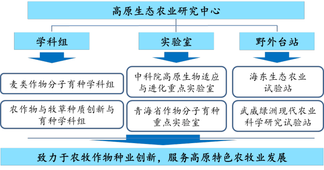 高原生态农业研究中心,其前身可追溯至1962年研究所成立时其下属植物研究室内设的遗传生理研究组。1970年,为了适应研究所研究方向的调整,遗传生理研究组从植物研究室分离出来成立农业研究室。自2000年起,根据中国科学院知识创新工程的要求,研究所对自身学科定位和研究领域进行了优化调整,在原农业研究室的基础上组建成立高原生态农业研究中心,成为研究所三大主体科研机构之一。目前,中心下设省级重点实验室1个:青海省作物分子育种重点实验室,建有2个所级野外台站:中科院海东生态农业试验站和中科院武威绿洲现代农业科学研究试验站。