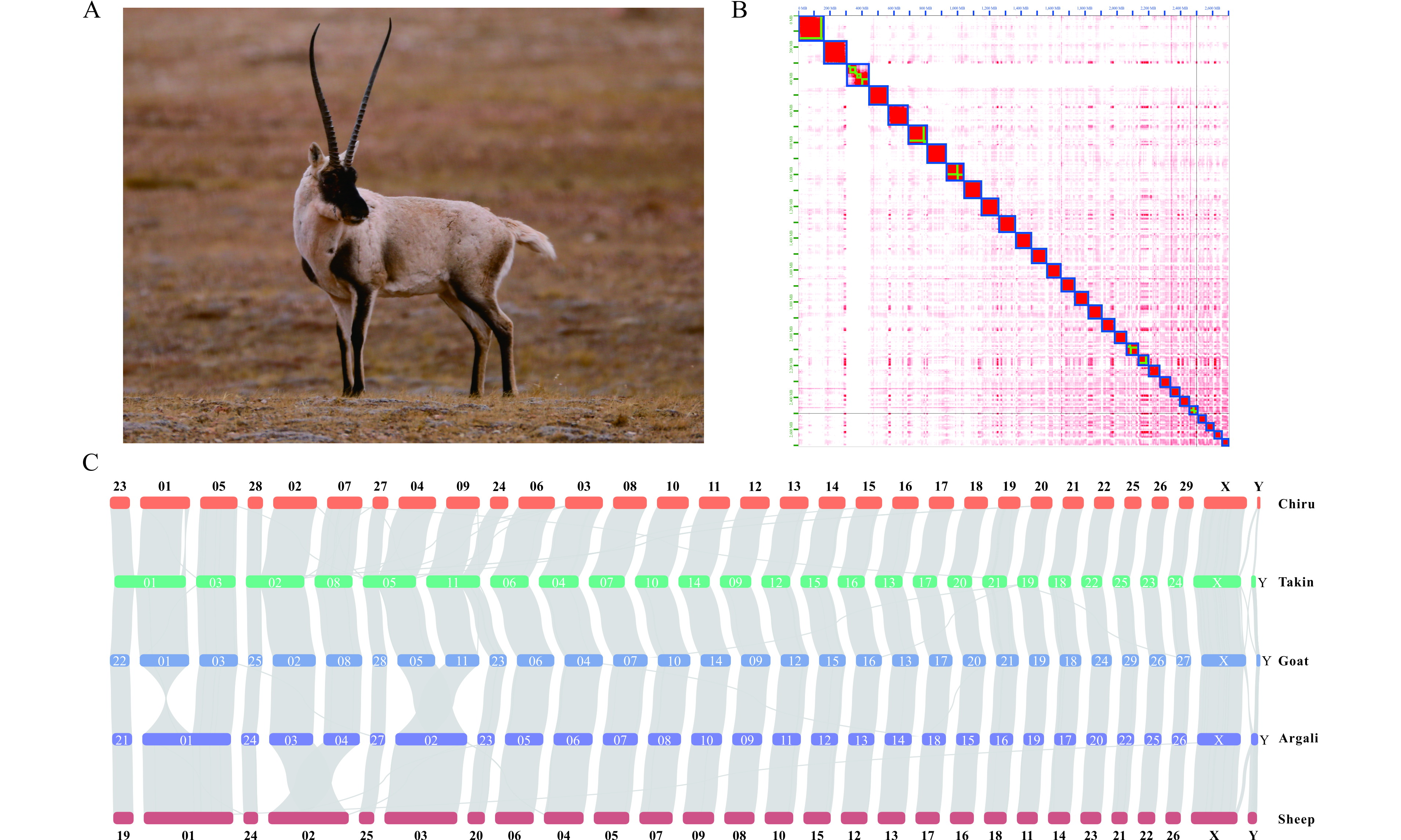 藏羚是世居青藏高原的典型反刍动物,平均分布海拔3,250至5,500 米,属鲸偶蹄目,牛科,藏羚属,是藏羚属唯一物种。实验室动物生态与资源保护研究团队联合青海大学,基于三代基因组测序、测序和二代基因组测序三种测序技术,成功组装了藏羚染色体级别的基因组。首次获得了藏羚染色体水平的高质量基因组和注释信息,为藏羚的适应进化遗传机制、保护遗传学研究及进一步探索物种迁徙行为的遗传机制提供了重要的基因组资源。