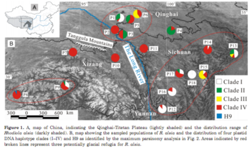 青藏高原隆升和第四纪冰期气候的反复变化对该地区高山植物的分布范围和遗传分化产生了深远影响。对青藏高原特有的多年生草本植物——西川红景天Rhodiola alsia 18个居群227个个体进行了谱系地理学研究。根据cpDNA和ITS遗传多样性分布格局,推测西川红景天在第四纪冰期可能存在三个相互独立的避难所:青藏高原东南部边缘避难所,唐古拉山北部避难所和唐古拉山南部避难所。分歧时间估算结果表明,西川红景天ITS序列主要支系的分歧时间位于更新世中晚期(0.87-0.35Mya)。更新世冰期与间冰期交替所导致的气候波动可能是西川红景天物种内遗传分化的一个重要驱动因素(Botanical Journal of the Linnean Society, 2012)。对高山绣线菊进行谱系地理学研究得出了相似的结果。利用叶绿体DNA测序技术对高山绣线菊(Spiraea alpina)43个居群528个个体进行了谱系地理学研究,发现该物种在末次冰期时存在多个冰期避难所,冰期时气候的强烈波动可能引发了物种内遗传分化(Journal of Systematics and Evolution,2012)。