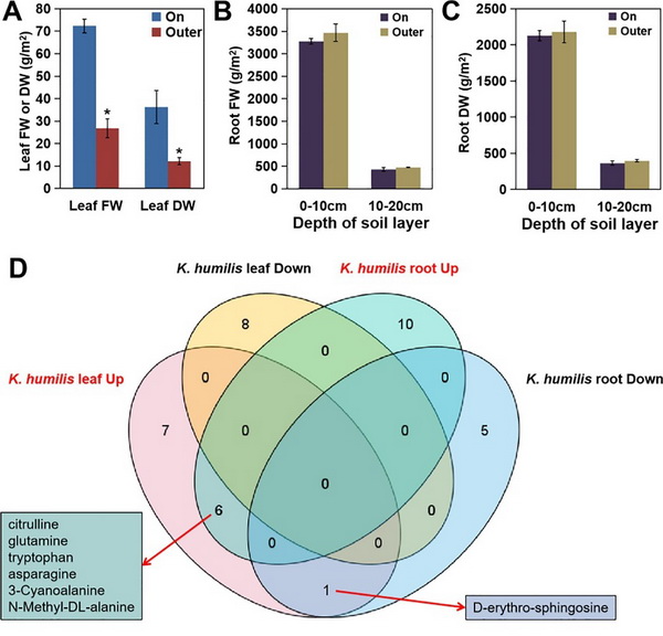 A.双孢蘑菇圈内外生长的矮嵩草叶片鲜重 (FW) 和干重 (DW) (A);B. 双孢蘑菇圈内外生长的矮嵩草根鲜重(FW);C. 双孢蘑菇圈内外生长的矮嵩草根干重(DW);D. 与生长双孢蘑菇圈内生长的矮嵩草叶和根中代谢物变化的维恩分析