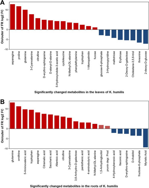 双孢蘑菇圈内外生长的矮嵩草植物的叶(A)和 根(B)中的代谢物发生显著变化