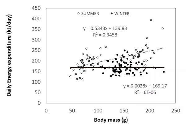 采用双标记水(Doubly-labelledwater)技术,研究人员在野外测定了高原鼠兔每日能量消耗(Dailyenergy expenditure, DEE)的季节变化,发现尽管冬季的平均环境温度比夏季低25oC,但高原鼠兔冬季每日能量消耗比夏季降低了约30%。热中性区内静止代谢率(restingmetabolic rate at thermoneutrality, RMRt)的测定结果显示冬季高原鼠兔代谢范围非常低(DEE/RMRt=1.60 ± 0.30),代谢范围对于动物的地理分布边界、繁殖输出和生存能力等具有重要的决定作用。