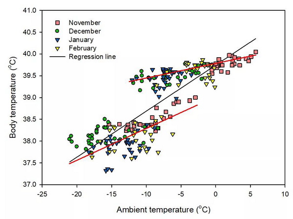 腹腔埋置温度记录器的高原鼠兔(n=6)夜间和白天体温的平均值与环境温度之间的关系(图中的直线表示线性关系:红色直线表示夜间和白天体温分别对环境温度的线性拟合关系,黑色直线表示所有温度数据对环境温度的线性拟合关系。鼠兔的体温随环境温度的降低而下降,且在夜间时更加明显)。