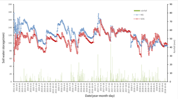 海北站对减牧处理的重度退化草地进行了7年的连续监测,草地由重度退化阶段恢复为中度退化阶段。草地生态系统生物量、凋落物和植被覆盖率都有所增加,2018年的土壤贮水量比2012年高出41.9%。土壤贮水量的改善主要是由表层土壤含水量增加引起。从16种环境因子中筛选了影响贮水量关键环境因子,分别为:空气温度、凋落物、土壤热通量、降水和风速,它们分别能解释土壤贮水量变异的50.52%、24.02%、10.86%、7.82%和6.77%。面对当前和未来气候变化对高寒草原土壤水分保持的威胁,减牧和禁牧处理是恢复退化草地贮水能力的有效解决方案。