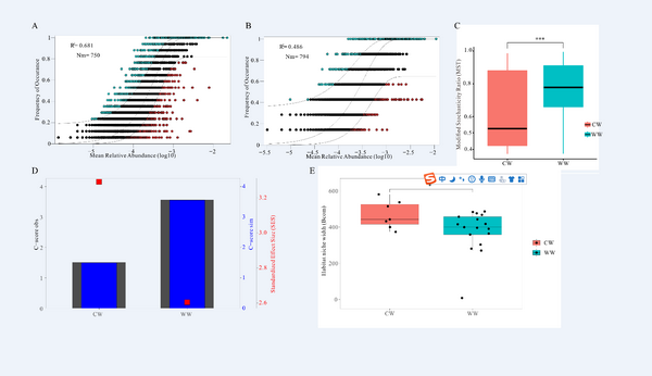 为深入探讨圈养对白唇鹿肠道微生物群落结构和生态过程的影响,实验室动物进化适应与濒危物种保护学科组基于16S rRNA V3-V4区测序,利用QIIME2流程方法对圈养和野生白唇鹿粪便微生物结构和组成进行了分析。结果表明,圈养白唇鹿肠道菌群中厚壁菌门 (Firmicutes)相对丰度低于野生种群,而拟杆菌门 (Bacteroidetes) 相对丰度高于野生种群;在属水平上,条件致病菌和果胶分解菌相对丰度较高。PCoA分析表明野生白唇鹿和圈养白唇鹿的肠道菌群组成和功能存在显著差异。零模型、中性群落模型和生态位宽度联合分析表明,圈养通过提高确定性过程的贡献,改变了其肠道微生物群落的生态组装过程。综合以上结果,研究认为,圈养能够通过持续施加选择性压力而改变白唇鹿肠道微生物,从而对其宿主产生潜在的不利影响。本研究为濒危物种的保护生物学研究提供了新的研究手段和视觉。