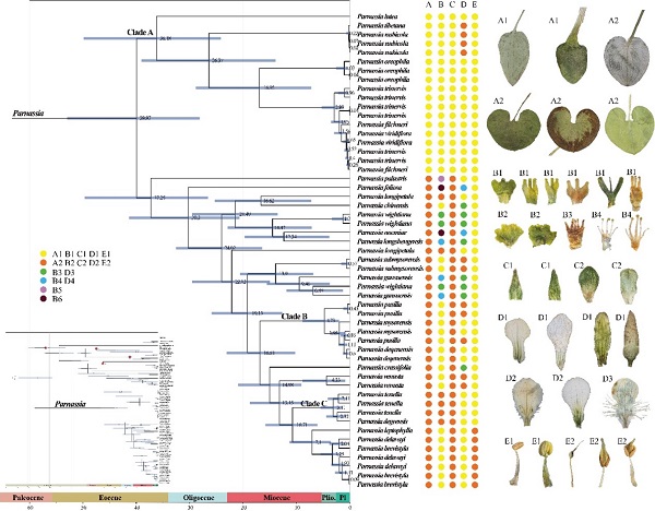 梅花草属(Parnassia L.)隶属于卫矛科(Celastraceae),主要分布于北温带高山地区,我国西南部山区是该属分布和分化的中心区域。长期以来,梅花草属的系统位置存在较大争议,且存疑物种较多,亟需建立全面可靠的系统发育关系。实验室青藏高原植物适应与进化学科组以梅花草属25个物种及卫矛科23为研究材料,利用高通量测序平台获取并组装质体基因组和核糖体DNA序列。结合GenBank数据库中已发布的蔷薇超目质体基因组序列,采用最大似然法和贝叶斯法构建了梅花草属高分辨率的系统发育树(图1),支持了大量分类学修订建议:梅花草属为单系,且与卫矛科的亲缘关系最近。通过分歧时间估算,发现梅花草属于渐新世开始分化,中新世早期和中期的造山运动和亚洲季风促进了本属的物种多样性和分布区域的扩散,中新世晚期或上新世时期,青藏高原的最终抬升和气候振荡共同推动了梅花草属物种的快速辐射演化。此外,横断山脉及其毗邻山区的梅花草属物种中可能存在广泛的杂交或渐渗事件,基生叶形态特征可以作为展示本属物种间演化关系的关键性状,而部分被广泛用于分类、分组的性状则是平行演化的结果(Frontiers in Plant Science 13: 855944, 2022)。