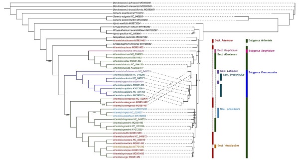 蒿属(Artemisia L.)腺毛蒿组(Sect. Viscidipubes)以密被腺毛和粘质柔毛而得名,其中大部分为青藏高原特有种,主要分布在青藏高原东南边缘。由于其特殊的地理分布,使得该组物种在之前有关蒿属的研究中很少出现。利用二代测序技术Illumina和三代测序技术PacBio分别对蒿属腺毛蒿组的甘青蒿(Artemisia tanggutica)进行测序,并分别组装及混合组装。通过PCR验证,混合组装获得的叶绿体基因组最为准确。结构分析发现重复序列在叶绿体基因组中的分布存在一定的差异(图3),光系统II和核糖体大亚基基因具有较高的核苷酸替代率。系统发育分析发现腺毛蒿组嵌在艾组中,蒿属可能为多系起源,与亚菊属和菊属的系统发育关系还需要进一步的研究(Biologia, DOI:10.1007/s11756-021-00951-2, 2022)。
