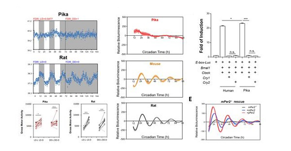 高原鼠兔(Ochotona curzoniae)是青藏高原特有的植食性小哺乳动物,对低温和低氧有极好的适应。通过监测高原鼠兔体温与昼夜活动节律,发现该动物的体温与昼夜活动节律极弱甚至完全衰竭;细胞和分子层面的生物钟具有振幅低、节律紊乱等特征。荧光素酶报告基因实验发现高原鼠兔的Clock、Bmal1、Cry1/Cry2具有正常的转录激活/抑制功能,且向小鼠Per2-/-成纤维细胞回补高原鼠兔的Per2可以重建稳定的生物节律,说明高原鼠兔核心生物钟基因的自身功能并无异常。