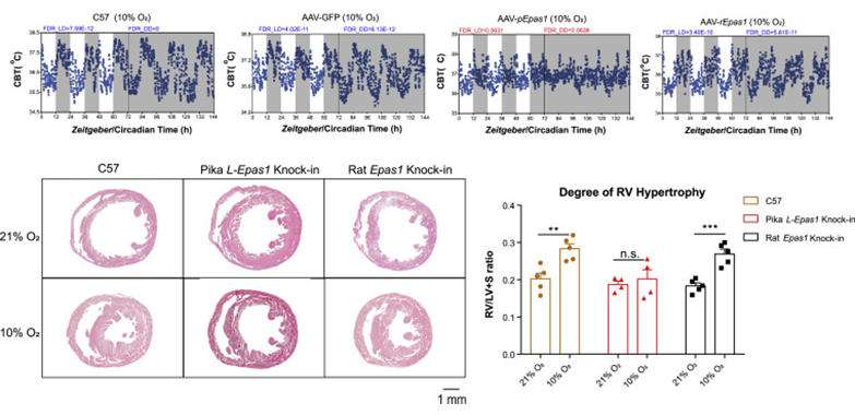 研究人员使用CRISPR/Cas9构建了敲入高原鼠兔L-Epas1基因的C57小鼠。将敲入高原鼠兔L-Epas1基因的小鼠的视交叉上核进行体外培养,发现敲入高原鼠兔L-Epas1基因使SCN的生物节律对缺氧胁迫更加敏感。通过注射AAV病毒使小鼠在SCN特异性表达高原鼠兔L-Epas1可以使小鼠在低氧环境下体温节律的稳定性下降,证明Epas1稳定性增加会导致生物节律的衰竭。
