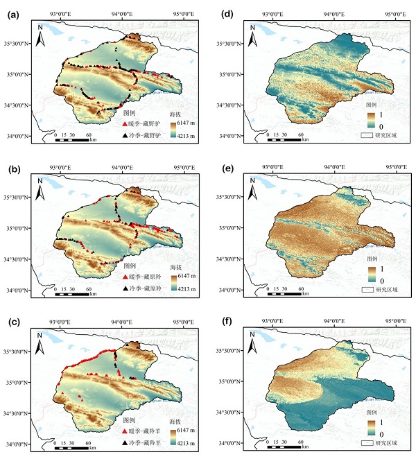 曲麻河乡主要大型野生食草动物分布(左侧)及生境适宜性分析(右侧)
