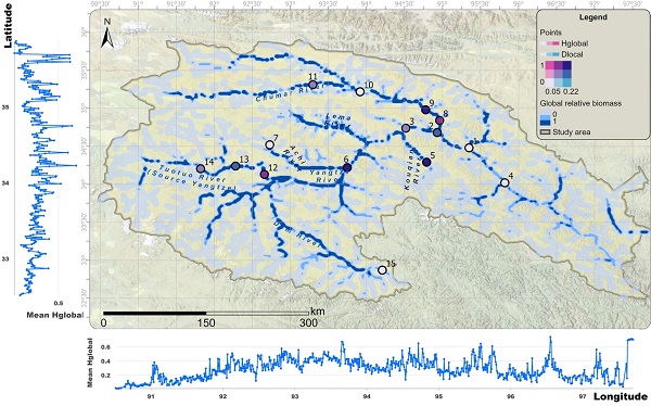 小头高原鱼的全局相对资源量/栖息地适合度(Global relative biomass/Hglobal)和局部绝对资源密度(Dlocal in g/㎡)