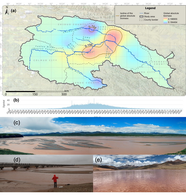 (a)小头高原鱼全局绝对资源密度(g/㎡)及其与海拔的关系(b);(c、d)资源分布冷点区辫状河流典型生境;(e)资源分布热点区高原峡谷型生境