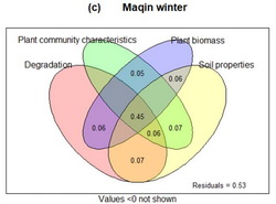 达日冬季草场(a)、玛沁夏季草场(b)及玛沁冬季草场(c)高寒草甸土壤微生物碳氮磷含量及其化学计量比的方差分解分析