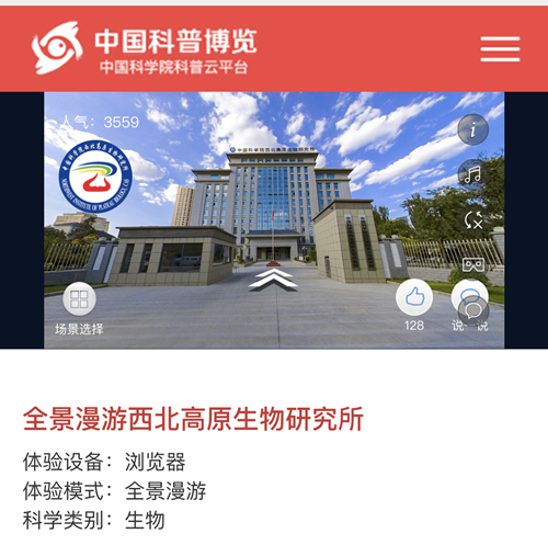 “全景漫游西高所”,通过分享研究所园区VR漫游视频,让公众在线上对西北高原所有直观的认知。