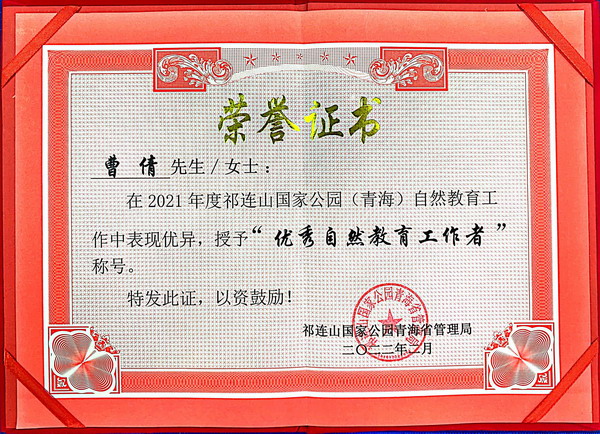 西北高原所曹倩喜获2021年度优秀自然教育工作者称号