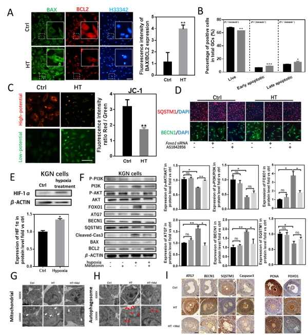 A:Bax/Bcl-2免疫荧光染色;B:流式分析凋亡细胞比例;C:JC-1染色指征线粒体膜电势;D: BECN1,SQSTM1免疫荧光染色指征细胞自噬水平;E:体外低氧条件培养KGN细胞;F:Western blot检测褪黑激素处理下对照组和胚胎期低氧 KGN细胞中PI3K、p-PI3K、AKT、p-AKT、Foxo1、Atg7、Becn1、SQSTM1、Lc3b、Bax/Bcl2、Cleaved-Cas3蛋白的表达;G-H: 对照和低氧小鼠颗粒细胞透射电子显微镜图像;I:用Atg7、Becn1、SQSTM1、Caspase3、Pcna 和Foxo1对从对照组,低氧组和褪黑素处理组卵巢中进行免疫组化染色