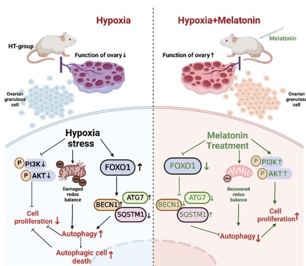 中国科学院西北高原生物研究所高原生物适应与进化重点实验室和中国农业大学团队合作建立小鼠胚胎期低氧模型,发现胎儿期低氧暴露会造成雌性小鼠的卵巢卵泡发育异常从而导致生育力下降。通过培养原代颗粒细胞试验证实:胎儿缺氧导致卵巢颗粒细胞(Granulosa cells, GCs)线粒体功能障碍,并且导致GCs自噬性死亡。随后通过对不同处理小鼠的颗粒细胞就行转录组分析发现:胎儿缺氧造成的GCs自噬性死亡由PI3K/Akt/FoxO通路介导。此外,团队使用褪黑素处理胚胎期低氧小鼠的颗粒细胞,研究结果发现:褪黑素可改善低氧诱导的GCs自噬,并且缓解GCs的凋亡。为探究这一发现是否适用于人类,团队进一步使用褪黑素处理低氧培养的人源颗粒细胞系 (KGN细胞),发现褪黑素在KGN细胞中有同样的作用。最后,研究团队进行体内实验,褪黑素腹腔给药处理经历过胚胎期低氧的雌性小鼠,发现雌性小鼠生育能力及卵巢功能得到一定的恢复。以上结果表明,胚胎期低氧导致GCs过度自噬和线粒体损伤进而造成GCs死亡和增殖缺陷,导致卵巢功能和生殖能力下降。此外,褪黑素可以恢复GCs功能并改善卵巢功能衰竭的情况。本研究首次聚焦于胚胎期低氧对生殖的影响,并为提高低氧应激女性的生殖力提供了一个潜在的补救措施。