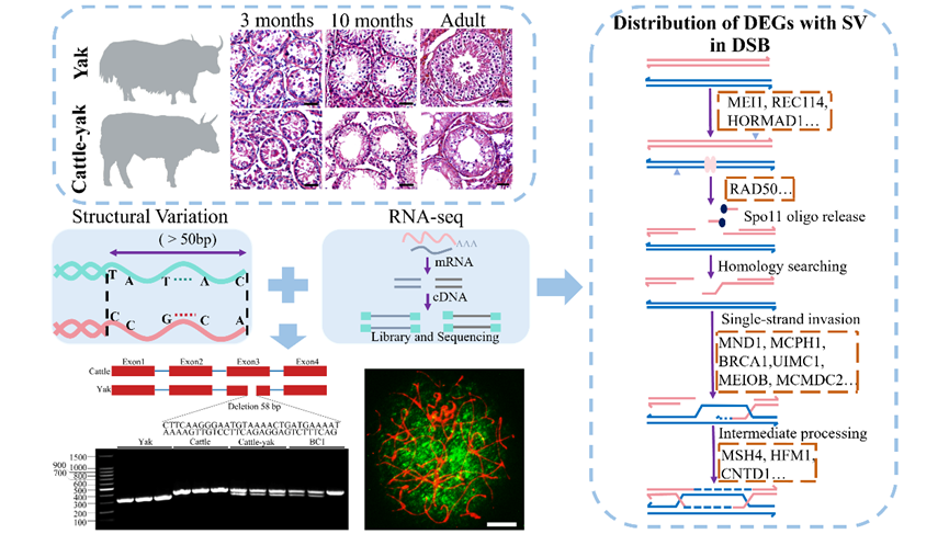 实验室动物生态与资源保护研究团队通过整合牦牛和普通牛基因组SV位点信息和转录组数据,对牦牛、犏牛和回交一代(BC1)睾丸组织在几个关键发育阶段的组织学特征、转录组图谱以及SV在差异表达基因(DEGs)中的分布进行了表征。结果发现,在犏牛睾丸组织中,与精原细胞命运决定、减数分裂重组和DSB修复等过程相关的基因表达下调,且在每个发育阶段犏牛中均有一定比例的DEGs含有SV。比如,3月龄犏牛27.78%的DEGs(50/180)中分布有180个SV,其中大部分SV(147/180)位于内含子区;10月龄犏牛27.73%的DEGs(1750/6310)中分布有8741个SV,其中大部分SV位于内含子区(7640/8741),少量的SV位于外显子区(50/8741)和UTR区(18/8741)等,这些SV可能会影响基因的表达。对其中的候选基因ESCO2和BRDT进行了表达验证,发现ESCO2在牦牛和犏牛精母细胞细线期表达,BRDT在牦牛精母细胞偶线期和粗线期表达,但在犏牛中只在偶线期表达。相较于牦牛,犏牛中ESCO2和BRDT的表达均下调。此外,还发现差异表达的X连锁基因在10月龄(123/252)和成年(206/274)的犏牛中多数表达上调,这可能与减数分裂性染色体失活(MSCI)异常有关,凸显了 X 染色体在杂交不育中的作用。然而,相较于犏牛无法产生精子,BC1曲细精管中出现了少量的圆形精子,并且与精子形成相关的基因(TSSK6, TSKS, TBC1D21, TPPP2, SPPL2C等)表达上调,但仍低于牦牛正常精子发生水平,表明精子发生缺陷和基因表达异常在BC1中得到了部分恢复。本研究获得了牦牛和犏牛在关键发育阶段的DEGs 和SV位点信息,为了解SV在犏牛雄性不育以及物种杂交不育中的潜在功能提供了启示。