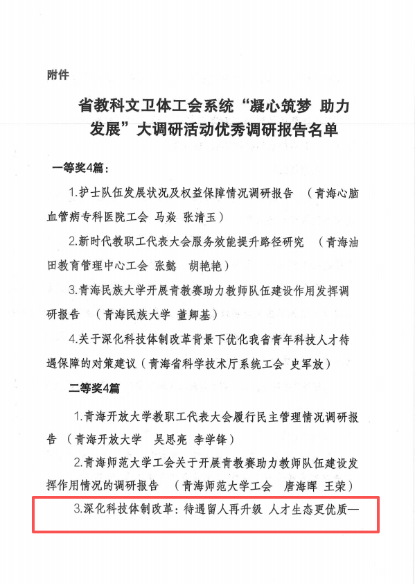 经青海省教科文卫体工会组织专家评审,共评出优秀调研报告22篇,由西北高原所人事教育处人事人才主管董亚慧撰写的《青年科技人才待遇保障情况调研报告》喜获二等奖。