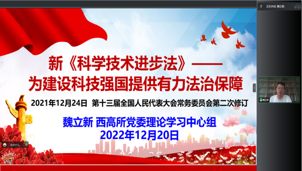 按照会议安排,副所长魏立新以“新《科学技术进步法》——为建设科技强国提供有力法治保障”为题,对《科学技术进步法》进行宣贯。报告从修订背景和意义、修订原则和思路、重点优化调整部分、主要修订内容、新法21条要点5个方面进行详细解读,报告指出《科学技术进步法》的修订,通过健全科技创新保障措施,完善国家创新体系,破除自主创新障碍因素等,为促进实现高水平科技自立自强提供法治保障。