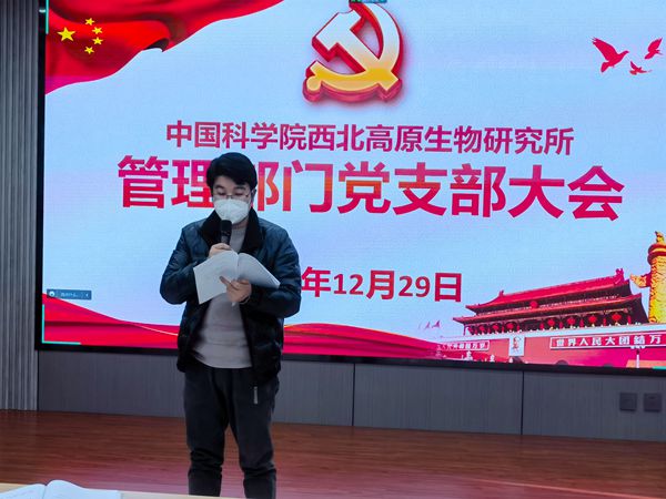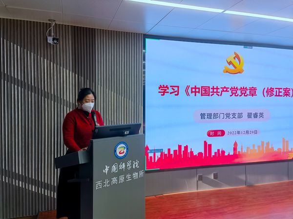 12月29日下午,中国科学院西北高原生物研究所管理部门党支部召开党员大会,深入学习贯彻党的二十大精神和新修订的《中国共产党章程》。管理部门全体党员参加学习会,会议由支部书记兼纪检委员翟睿英主持。