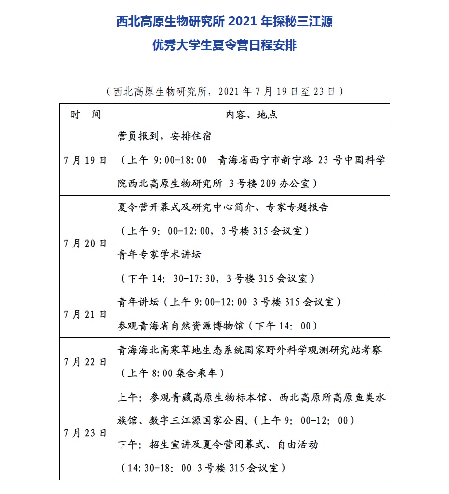 西北高原生物研究所2021年探秘三江源优秀大学生暑期夏令营日程安排