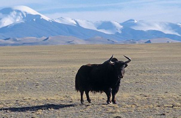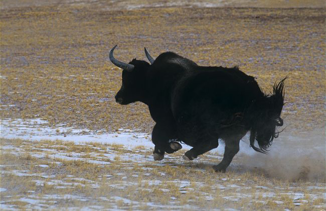 野牦牛是家牦牛的祖先,曾经分布很广泛,现在仅存在青藏高原上。野牦牛体重可达1000公斤以上,身体呈黑褐色,体侧下方和腿部有浓密的长毛,适于严寒环境中生活。野牛一年四季住在山坡,喜欢吃柔软的邦扎草,夏季里用牙啃,冬天就用舌头舔。野牛多刺的舌头十分厉害,也是它的武器之一。 野牦牛通常20-30只在草原上游荡、觅食,有时也会结成200-300头结成大群活动,据说为了保护牛犊。有人亲眼见到十三头母野牛一律头朝外围成圆圈,保护圈内一群小牛,对抗圈外的四头恶狼。野牦牛一般不主动进攻人,它硕大的体格、从容不迫的风度,显示一副端庄、憨厚的模样。