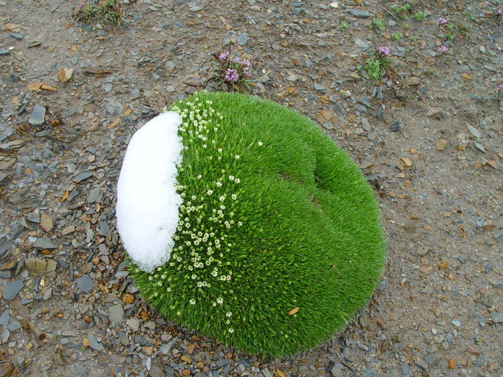 属高等植物石竹科。藏语叫“阿仲尕得”。多年生垫状草本,主根粗壮,木质化,茎高寸许,簇生,外形半圆球状,枝叶密集,花色白,冬寒盛开。