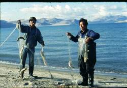 小郑早已为我们在定日找好县委招待所。第一顿饭是在县货车司机家中吃的,几盘“手抓羊肉”、“炸油饼、狗浇尿”、“酥油茶”、“奶酪”我喜欢的藏族食品都上桌了,还有大宗的啤酒和“二锅头”。我不能喝酒,但是“手抓”“奶皮”吃了不少。县司机十分感谢我们在西宁为他们联系到全县人最喜欢的啤酒,而且拉回的啤酒一瓶没损失。为此我真替他们高兴。原来这位司机师傅技术好、人特别细心。他得知桥断消息后就在路上等修好桥才走免得在便道上把酒颠破,或出更大的问题。定日全县人口3000,县城数百人,县机关几十人。他们对外地来客非常热情。当他们知道上次来的女老师又来啦,不由得更加欢迎。司机好客邀请几位县干部与我们一起吃饭,其中公安局长说:“定日除了大江大湖外,还有个小神湖,鱼特多”。我当即与他约好后天顺道去看看小神湖。第二天我们准备好渔具,又协商定日工作计划。第三天同局长一起开车到神湖村看神湖。去了一看,小湖不足400m2 ,水挺深,清澈透底。游鱼很多,鱼体斑纹都看得很清楚。小湖背靠村庄,面向定日河。湖周外围有一宽2m的深水壕沟围拢,似是神湖的防河水上涨的围墙。我们正在观察小湖时,村民早已看到我们。突然有个老乡爬到房上,神色十分惊慌的喊:“有人要抓鱼了!有人要抓鱼了!”。此时我担心这个点没希望了,千万别搞出纠纷来就算好。于是我和局长说:“请告诉老乡我们没抓鱼,只是站在边上看看,这些鱼很好看”。以后吴翠珍和局长一块找到喊话的老乡,他就是村长。村长认识局长,局长向他介绍吴翠珍说:“阿姨西宁来的,要买几条回去养大,让鱼在西宁传种接代繁衍子孙。阿姨还带着活水箱氧气袋,保证鱼活着到西宁。”村长看到车上的活水箱后,就去同村民商议,然后说:“只能打一网,打上打不上看神”。为了避免影响神湖的神灵,我在深水壕沟中撒了一网。网住足有百余尾,我立即叫小郑取下活水箱放进20尾鱼,冲上气,网内余下的全部倒回壕沟。村长和局长看到我在壕沟的行为,一网打这么多鱼,而且打了又退回这么多,十分奇怪、佩服。因为这里无人见过撒网捕渔,感觉撒网很神。村长于是对局长说:“不能再要钱”。回家的路上对神湖鱼这样密集我十分纳闷、不理解。更不理解的是染色体观察结果神湖这种鱼的染色体2n=66是裂腹鱼中最少的,为什么会这样?答案需要后人去解。