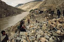 8月13号我俩乘越野车离开拉萨,到达羊卓雍湖后,听说前面的公路桥被水冲断,堵车很多半天过不去。于是当天我们就住进郎卡子兵站招待所,决定顺便在羊湖附近的溪流中采集,第二天再趁早赶路,这样可把断路等车的时间利用到采标本上。第二天我们一早赶到断桥处,工人们忙着铺路(图14、15)。前面没有几辆车,只需要排队上边道,我们颠簸在临时铺的便道上,绕了好大一圈才转到公路上。中午到达拉孜,吃过饭,下午很快就赶到日喀则。当与司机扎西握手告别时,扎西告诉我去定日用车可再与日喀则登山协会联系,他们一定会给帮助的。
