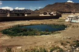 在日喀则我们住畜牧兽医站招待所,招待所就在兽医站大院内。大院有实验室、职工食堂等,可以说我们需要的一概俱全。院内还有一个十分特殊的小湖(图16)。小湖无人管理,周围杂草丛生,但湖内有很多鳅类,捕捉起来非常方便。小湖与大河相隔甚远,鱼是怎么到小湖的?仔细查看其周围也不见有河水流入的痕迹。这些鱼绝不会是天上掉下来的吧!最后我只能这样想:以前的小湖水是与河流相通,由于兽医站建设施工掩埋了小湖的河流通道,而只保留下小湖在大院内,湖内留下的鱼就在湖中自生自灭的发展到现在。