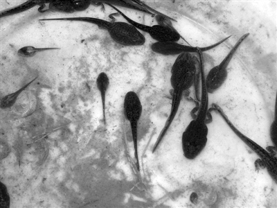 这就是在一条河里并存的三种形态的蝌蚪,科学家将它们捞出,供研究对比之用。