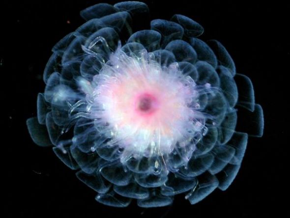 这种粉红色管水母学名“Athorybia rosacea”,是海洋生物普查项目组远征东大西洋马尾藻海期间发现的。与僧帽水母一样,这一新物种实际上也是一种群体生物,由大量动物构成。