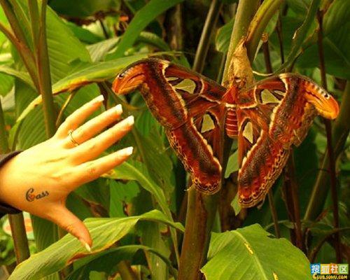 5、皇蛾(Atlas moth) 色彩斑烂的皇蛾,翼长逾30公分,是世界上体型最大的蛾。雄蛾的触角呈羽状,而雌蛾的翅膀形状较为宽圆,腹部较肥胖。因为体型大,色彩鲜明,常常被制作成标本来贩卖。在台湾,还有人把它们的茧当钱包使用。