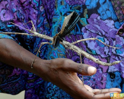2、竹节虫(Giant stick insects) 竹节虫生活在竹林里,形状细长似竹节,体长而大,为中型或大型昆虫,一般在10~30毫米,最大的260毫米,是世界上最长的昆虫。在长期的与敌斗争中,它们很善于伪装,当它栖息在树枝或竹枝时,活像一支枯枝或枯竹,很难分辨。高温、低温、暗光可使体色变深,相反,则体色可变浅。白天与黑夜体色不同,成为节奏性体色变化。它们还可以发出一种刺鼻气味,防御敌害。当受伤害时,稚虫的足可以自行脱落,而且可以再生。