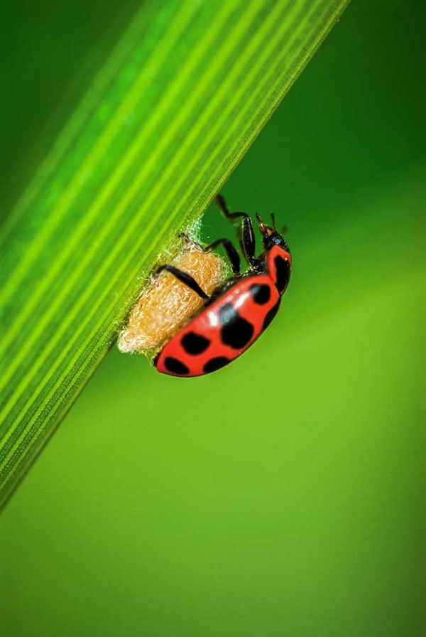 这只瓢虫正在保护它的敌人。腿之间的茧状物里是在从甲虫肚子中钻出来前以其内脏为食的寄生蜂幼虫。如今,研究人员发现了是什么让甲虫扮演着保姆的角色:它们感染了一种控制大脑的病毒。当幼虫出现并织出茧时,这种病毒让甲虫僵在原地不动,从而保护幼蜂免受捕食者的侵害。图片来源:MATHIEU B. MORIN