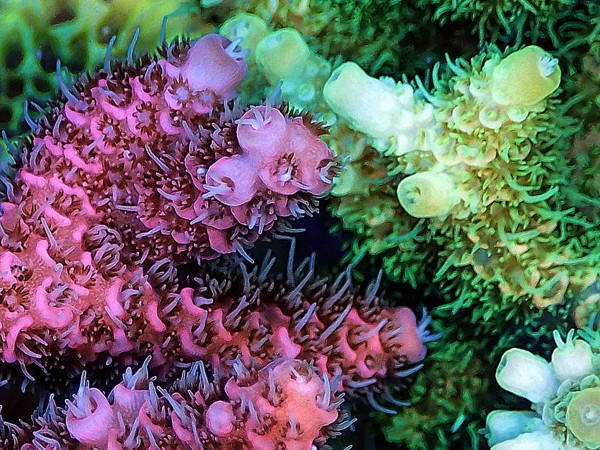 诸如图中所示的这些珊瑚依靠共生藻类获取来自太阳的能量。然而,太多的阳光会杀死藻类,因此珊瑚产生了可作为“防晒霜”的色素。在光照变强时,色素会越来越亮;当光线没有那么强烈时,颜色便会变得暗淡。如今,研究人员发现了珊瑚色素基因如何控制它们能产生的颜色范围。珊瑚拥有的色素基因拷贝越多,潜在颜色的范围便会更亮。图片来源:JORG WIEDENMANN