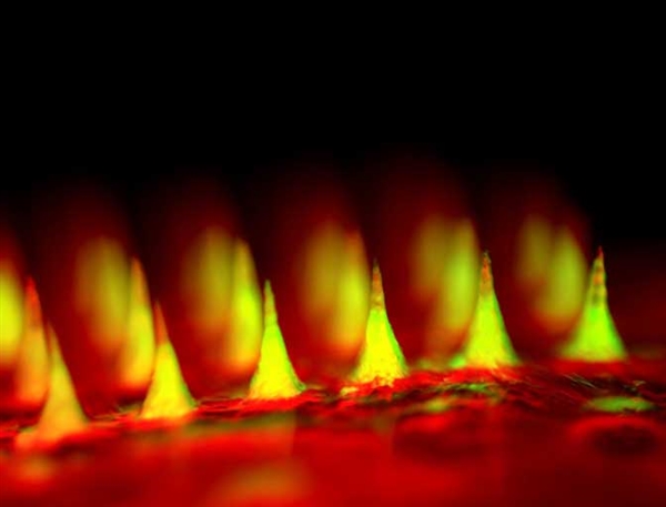 这些尖刺可能看上去很恐怖,但它们比一张信用卡的厚度还要短,并且在用到皮肤上时产生的疼痛不会超过被一只蚊子叮咬。一旦被贴在那里,作为对血糖浓度变化的回应,这些针会传递胰岛素。有一天,这些被贴在和一枚硬币大小相仿的胶布上的针可能会让糖尿病患者免受不得不向体内注射胰岛素之苦。图片来源:ZHEN GU