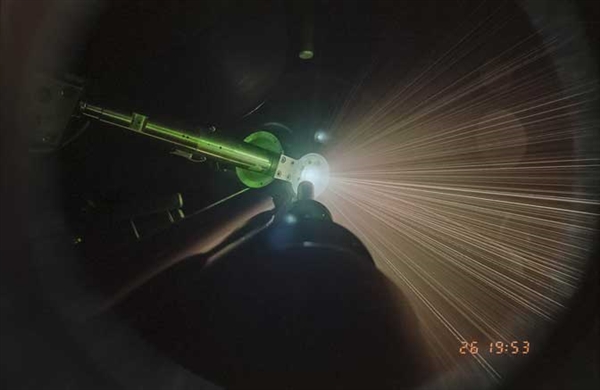 当超强激光击中钻石砧时,它们会瞬间将钻石汽化,但这只是图片所拍到试验的一个负面效应。来自激光射击的冲击波将氢和氦的混合物压缩,从而模拟了被认为存在于土星大气深处的条件。研究人员一直怀疑,高温和高压会让这两种元素像油和水一样分离。结果便是落向土星核心处的氦“雨”,并且释放导致土星发出更加明亮光芒的能量。图片来源:EUGENE KOWALUK