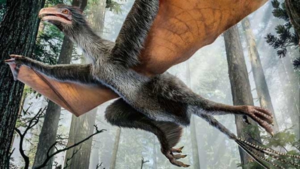 最近在中国发现的大小和鸽子相仿的恐龙同早期鸟类存在关联,但拥有完全不像其长有羽毛的近亲的翅膀。它有着从腕部延伸出来的棒状长骨。正如效果图所示,和蝙蝠一样,这种恐龙的长骨支撑着膜状翅膀。没有别的已知恐龙拥有此类棒状长骨,从而促使研究人员将这种生物命名为“Yi qi”——在中国普通话中是“奇翼龙”的意思。图片来源:DINOSTAR CO. LTD.