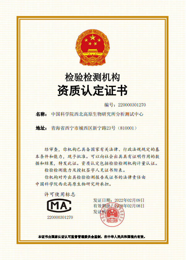 2022年02月09日,国家市场监督管理总局下发质量监督检验检疫准予行政许可决定书(国)质检(26023)许 准字[2022]000297号。依照《中华人民共和国行政许可法》第三十八条第一款和《检验检测机构资质认定管理办法》第九条的规定,准予中国科学院西北高原生物研究所分析测试中心为社会提供公证数据产品质量检验机构计量认证,行政许可有效期至2028年02月08日。